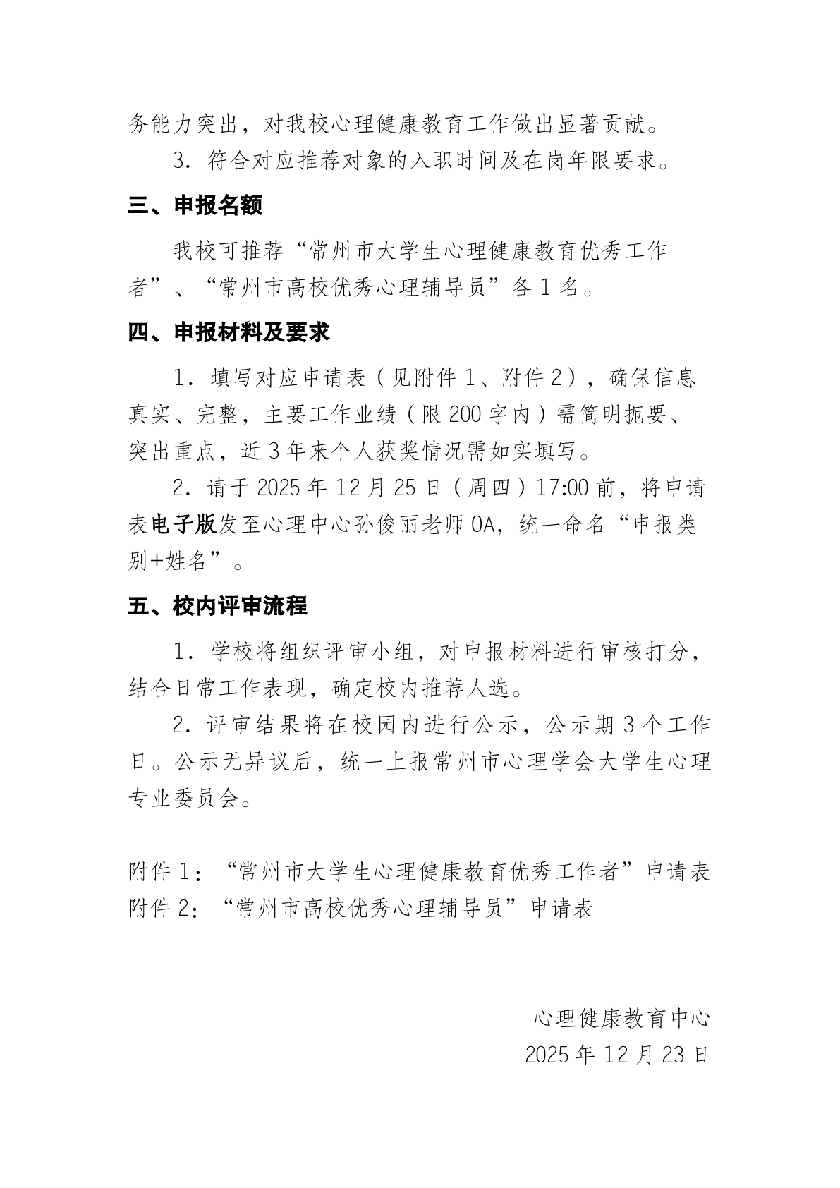关于开展2025年“常州市大学生心理健康教育优秀工作者”“常州市高校优秀心理辅导员”校内评选工作的通知