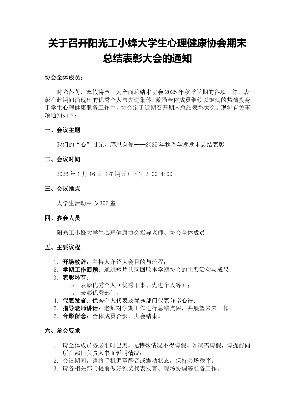 关于召开阳光工小蜂大学生心理健康协会期末总结表彰大会的通知